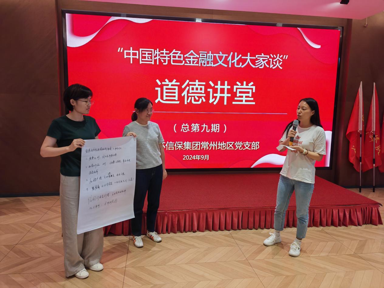 常州地區(qū)黨支部于近日開展了“中國特色金融文化大家談”道德講堂活動(dòng)。在前期充分開展調(diào)查研究基礎(chǔ)上,本期活動(dòng)緊扣學(xué)習(xí)貫徹黨的二十屆三中全會(huì)精神,聚焦主責(zé)主業(yè),分五個(gè)組從不同主題交流研討,深化對(duì)中國特色金融文化五大核心要義的理解認(rèn)識(shí),推動(dòng)形成有深度、有實(shí)效的實(shí)踐成果。