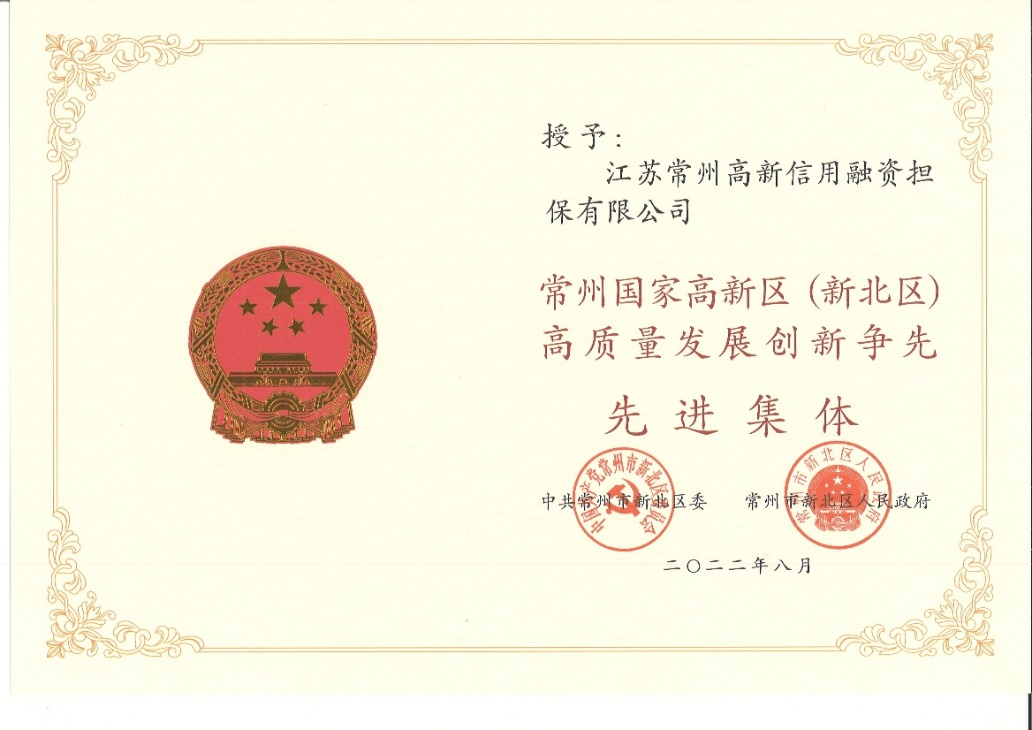 近日,常高新擔保榮獲常州國家高新區(新北區)高質量發展創優爭先先進集體榮譽稱號。