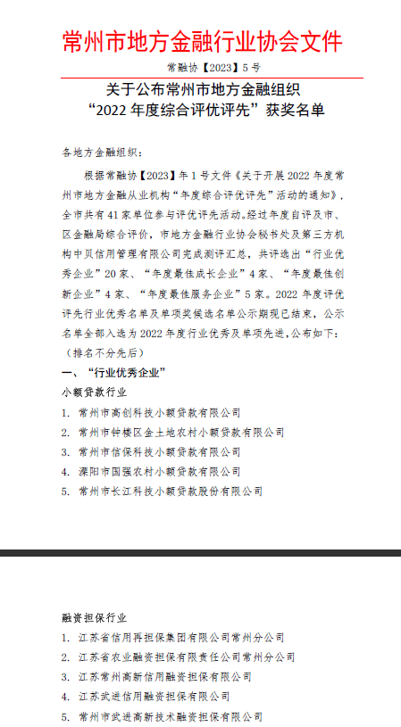 近日,常州市地方金融行業協會發布公告,公布了常州市地方金融組織“2022年度綜合評優評先”獲獎名單。經過年度自評、市區金融局綜合評價、市地方金融行業協會及第三方機構中貝信用管理有限公司測評,江蘇信保集團常州分公司、江蘇武進信用融資擔保有限公司、江蘇常州高新信用融資擔保有限公司均被評選為2022年度融資擔保行業優秀企業。
