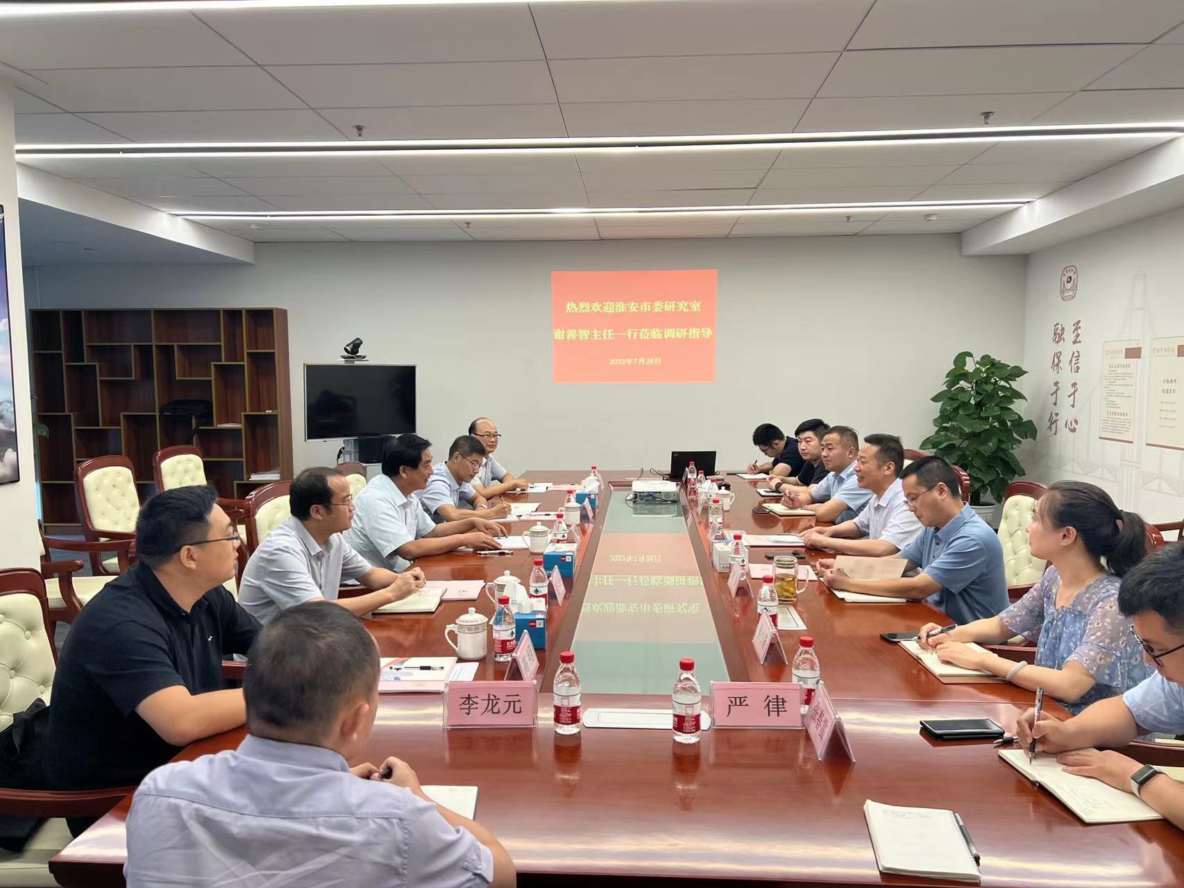7月28日,淮安市委研究室主任謝善智一行到淮安分公司調研營商服務情況?;窗彩形癄I商辦副主任張文兵,市委研究室財經處處長王志專、發展改革處處長吳克軍等參加調研。