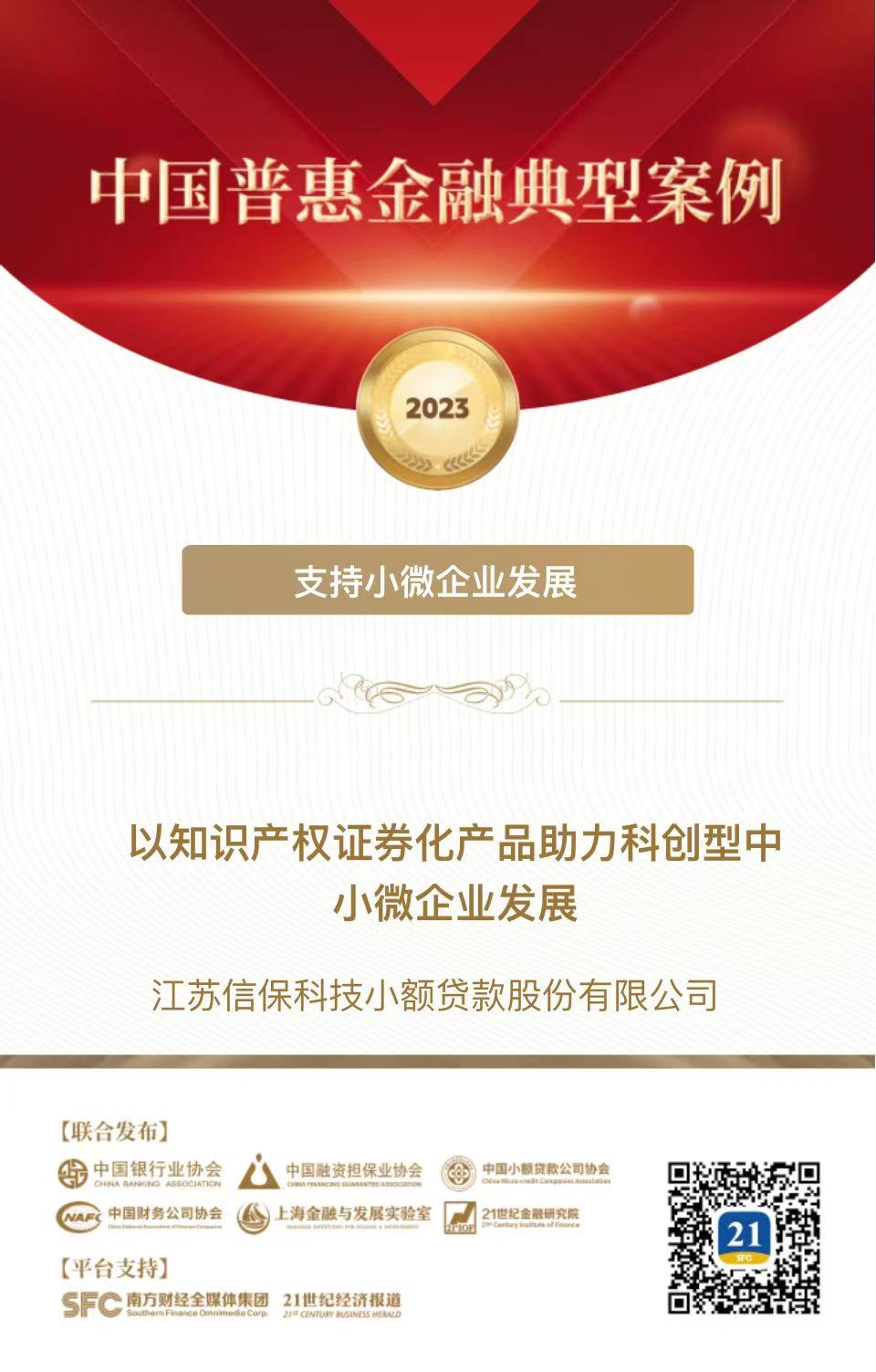 9月19日,“合普惠 新金融——2023中國普惠金融創新發展研討暨典型案例發布會”在北京舉辦,“中國普惠金融典型案例(2023)”名單在會上正式揭曉,由江蘇信保科技小額貸款股份有限公司(下稱“信保科貸”)報送的《以知識產權證券化產品助力科創型中小微企業發展》案例從全國761個參評案例中脫穎而出,入圍“支持小微企業發展案例”。