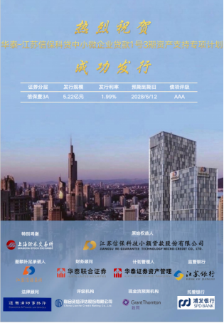 7月9日,科貸公司在上海證券交易所成功發行5.5億元“華泰-江蘇信保科貸中小微企業貸款1號3期資產支持專項計劃”,順利完成總規模15億元的中小微企業貸款資產支持專項計劃發行工作。本期ABS期限3年,優先級票面利率1.99%,創信保科貸資本市場融資利率新低。