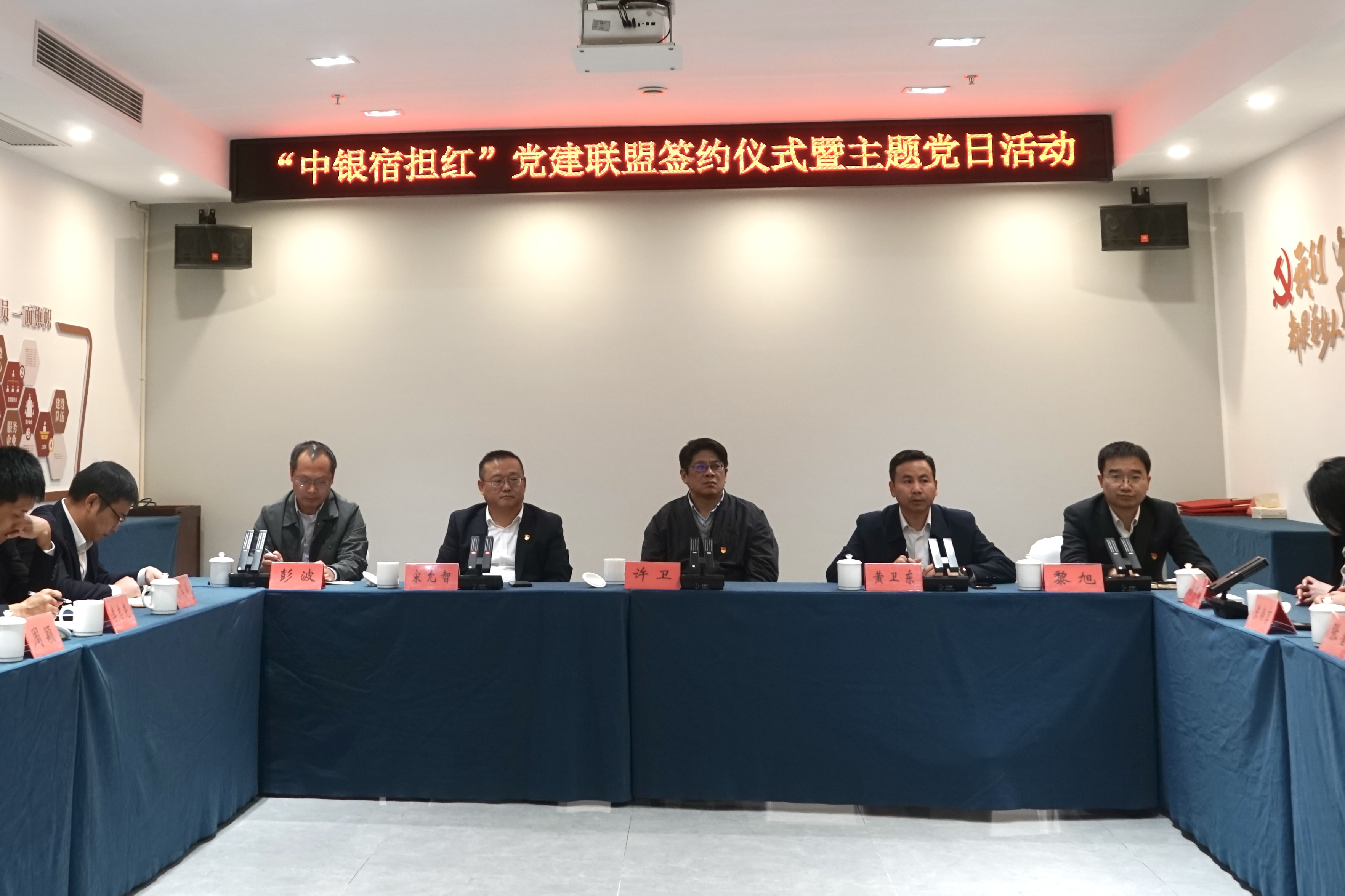 為進(jìn)一步深化銀擔(dān)合作,建立長期、穩(wěn)定、快速的合作交流機(jī)制,促進(jìn)黨建與業(yè)務(wù)深度融合,助推地區(qū)經(jīng)濟(jì)蓬勃發(fā)展。10月21日下午,宿遷分公司黨支部、中國銀行宿遷分行普惠金融事業(yè)部黨支部、泗洪縣盛達(dá)融資擔(dān)保集團(tuán)有限公司黨支部三方舉行“中銀宿擔(dān)紅”黨建聯(lián)盟簽約儀式。中共江蘇省委黨校投融資教研室主任許衛(wèi)、宿遷市政府辦金融法規(guī)處處長黃衛(wèi)東、泗洪縣黨史委副主任彭波參會指導(dǎo)。