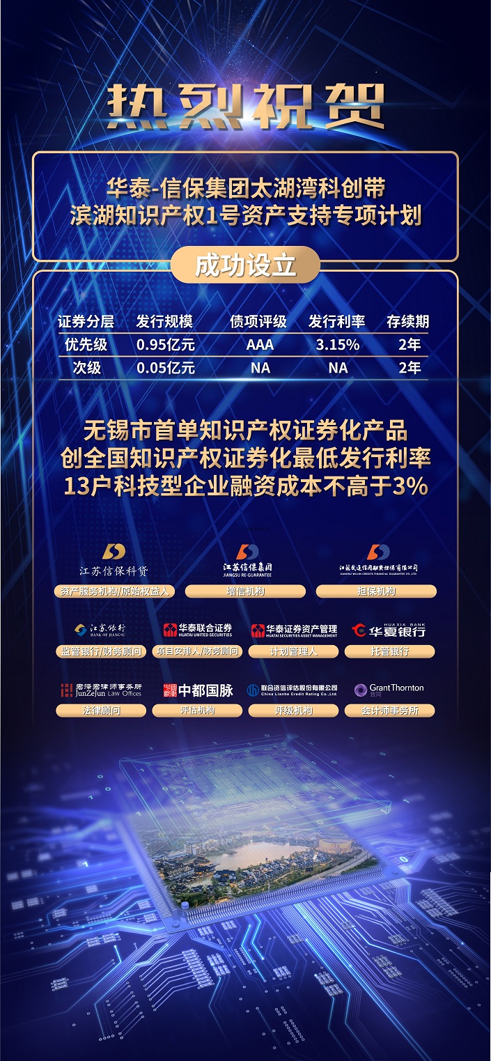 本項目是無錫市首單知識產權證券化產品,也是全國首單涉及集成電路布圖設計的證券化產品、全國首單“高新多”產業集合知識產權證券化產品,標志著無錫市知識產權證券化實現“零突破”。自項目正式啟動以來,歷時100天就成功發行,以“信保速度”為無錫搭建金融支持實體經濟、助力科技創新的新舞臺。