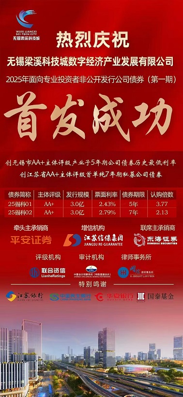 4月15日,由集團提供增信的“無錫梁溪科技城數字經濟產業發展有限公司2025年非公開發行公司債券”在深圳證券交易所成功發行。本期6億元債券的發行,標志著無錫梁溪科技城在深化產融結合、推動數字經濟高質量發展上取得新突破,也為地方國企創新融資模式提供了示范樣板。