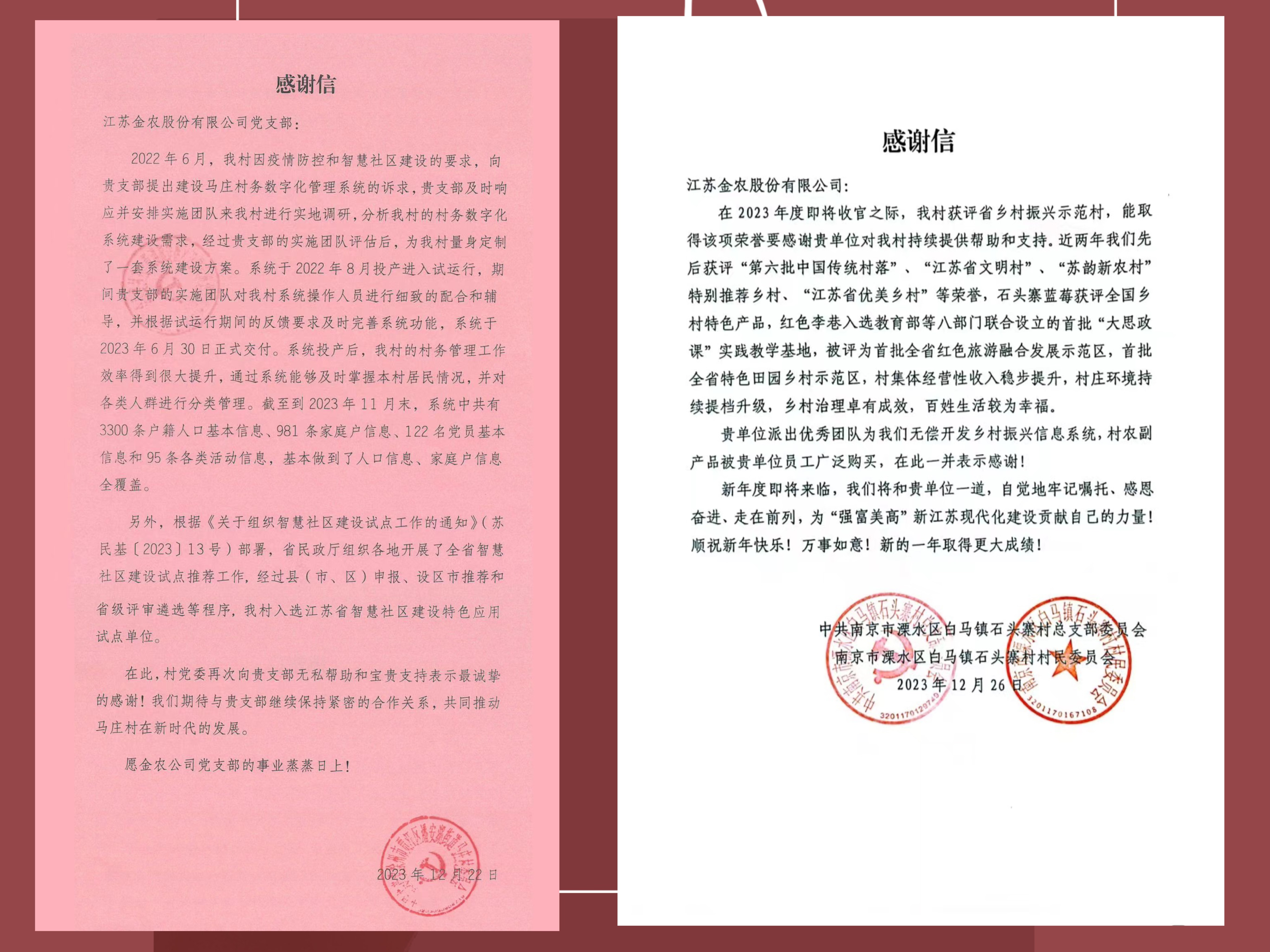 近日,南京市溧水區(qū)白馬鎮(zhèn)石頭寨村(以下簡稱“石頭寨村”)、徐州市賈汪區(qū)潘安湖街道馬莊村(以下簡稱“馬莊村”)分別向金農(nóng)公司發(fā)來感謝信。