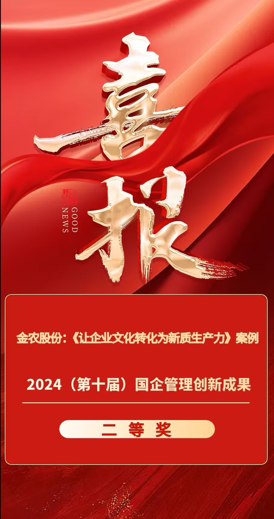 本次大會前,來自全國范圍的中央企業(yè)、地方國企、研究機(jī)構(gòu)和大專院校共申報創(chuàng)新成果(案例)4200余項,558項成果通過初審,經(jīng)過現(xiàn)場論證答辯、公眾投票與專家組終審等多輪競爭,最終通過審定的創(chuàng)新成果(案例)211項。《金農(nóng)股份:讓企業(yè)文化轉(zhuǎn)化為新質(zhì)生產(chǎn)力》(案例)脫穎而出,榮獲二等獎。其中,在公眾投票階段,該案例最終獲得10萬余票,受到社會各界廣泛關(guān)注、高度認(rèn)可,有力提升了公司品牌影響力,大力推動了公司戰(zhàn)略營銷。該案例還將被收錄在《國企管理創(chuàng)新成果年度報告》,并進(jìn)入國企管理創(chuàng)新典型案例庫。(金農(nóng)公司 駱樂)