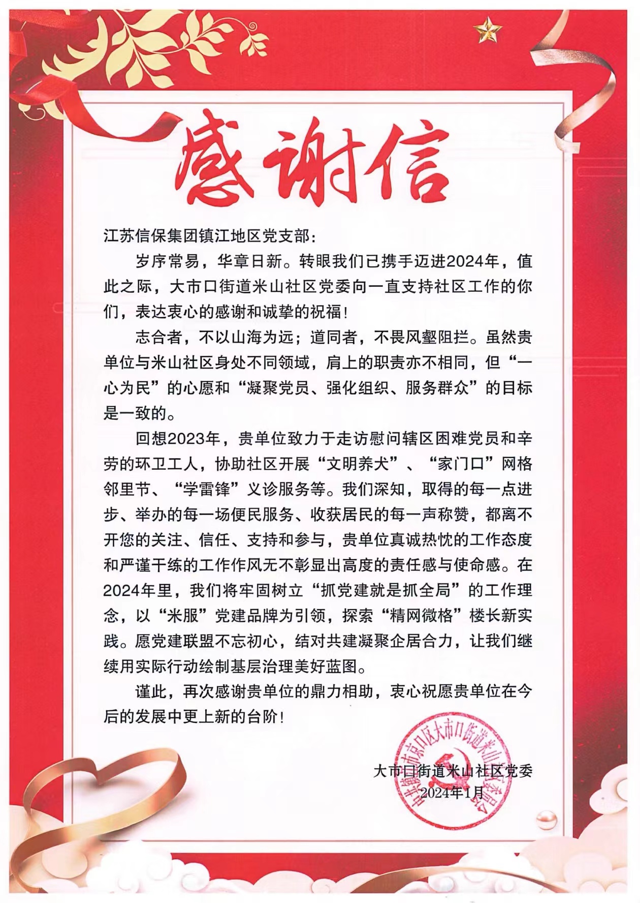2024年1月,江蘇信保集團(tuán)鎮(zhèn)江地區(qū)黨支部收到來自鎮(zhèn)江大市口街道米山社區(qū)黨委的感謝信,感謝鎮(zhèn)江一體化區(qū)域及鎮(zhèn)江地區(qū)黨支部對(duì)大市口街道米山社區(qū)工作的關(guān)心及支持。祝愿雙方黨建聯(lián)盟不忘初心,結(jié)對(duì)共建凝聚企居合力。